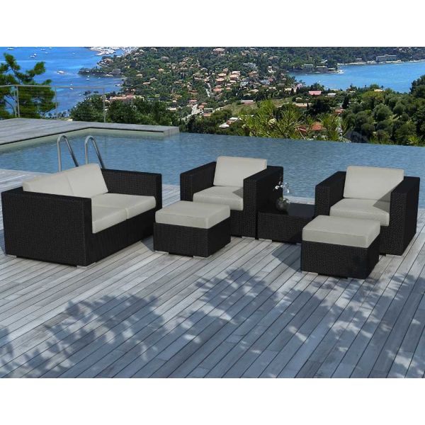 Salon de jardin 4 à 6 places en résine noire avec coussins ...