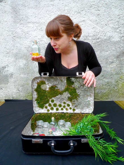 Terrasse ensoleillée donnant sur un petit jardin fleuri.